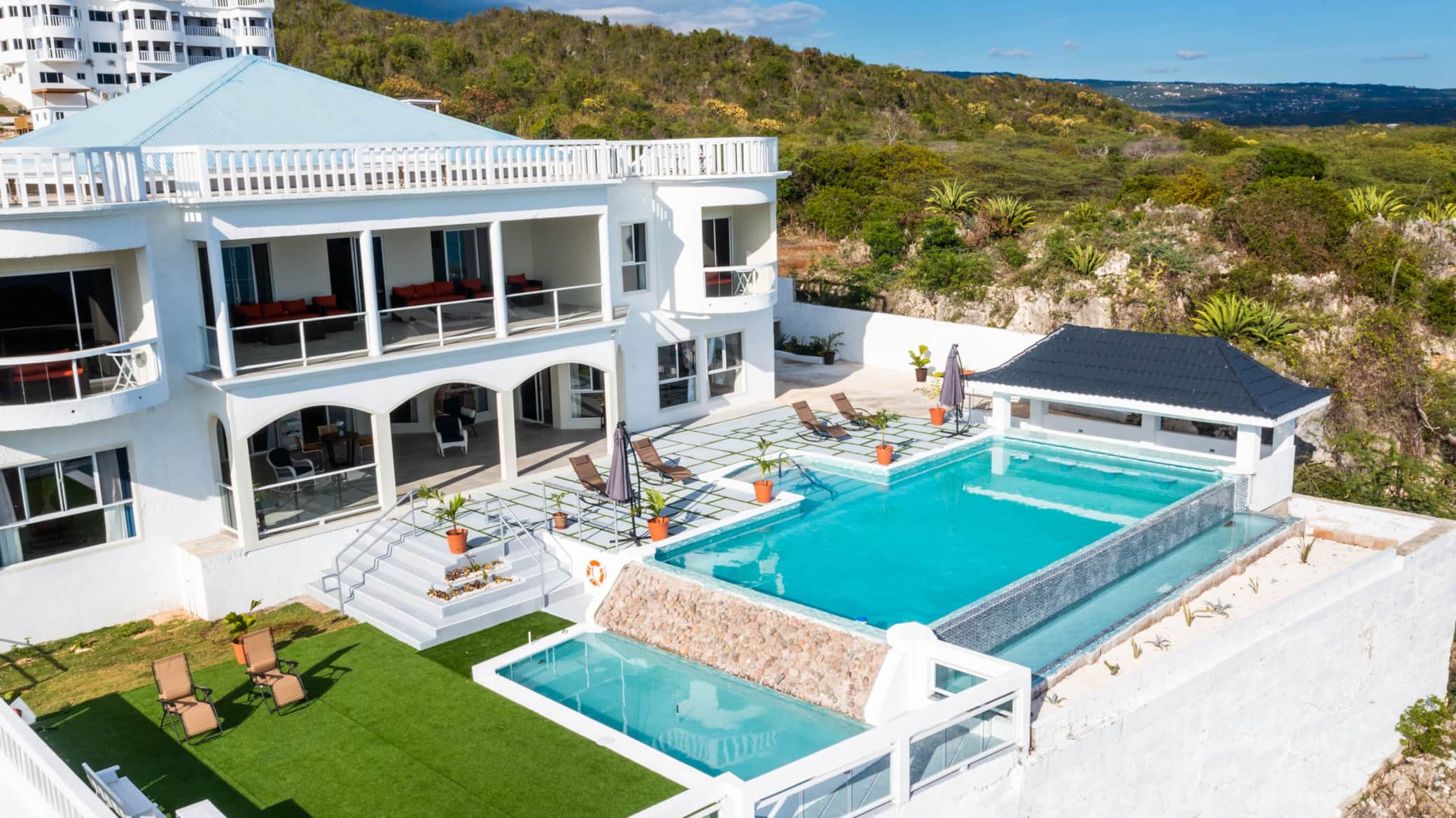 This luxurious vacation property offers an energetic and exhilarating experience. The ground floor features a fully equipped kitchen, a dining area with a stunning view of the Caribbean sea, two luxury bedrooms with private bathrooms, an arcade room, and a common living room with a view of the swimming pool. The infinity pool has a swim-up bar and a spectacular sea view. A dedicated workspace and a convenient powder room are also available. The second floor offers a patio with a breathtaking sea view, five luxury bedrooms with private bathrooms, and a hot tub in one of the bathrooms. The property includes a complimentary chef for breakfast and dinner, daily housekeeping services, 24/7 security cameras, and a gated entrance.